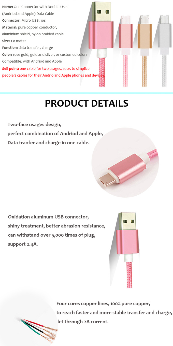 We offer perfect connection fast charging double sided micro usb cable with high accurate mold of connectors, stable and high speed charger & Sync. This is the current most popular cable we've been selling, comes with two-faced usages